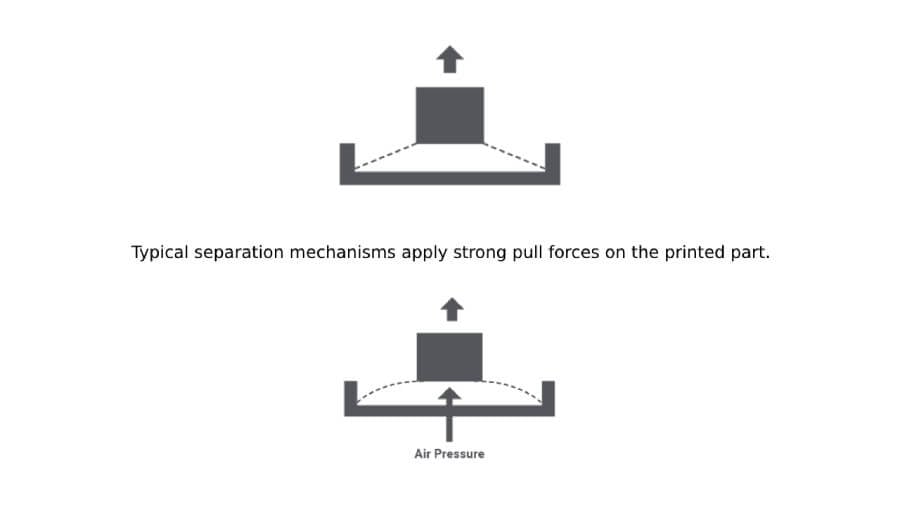 P3 DLP uses a pneumatic separation mechanism to apply far less separation force. The membrane gradually peels off each cured layer as the build platform goes up.