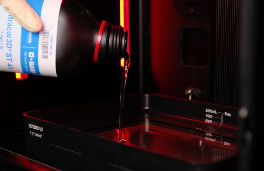 1. The vat contains a photopolymer resin, meaning a type of plastic that hardens when exposed to light.