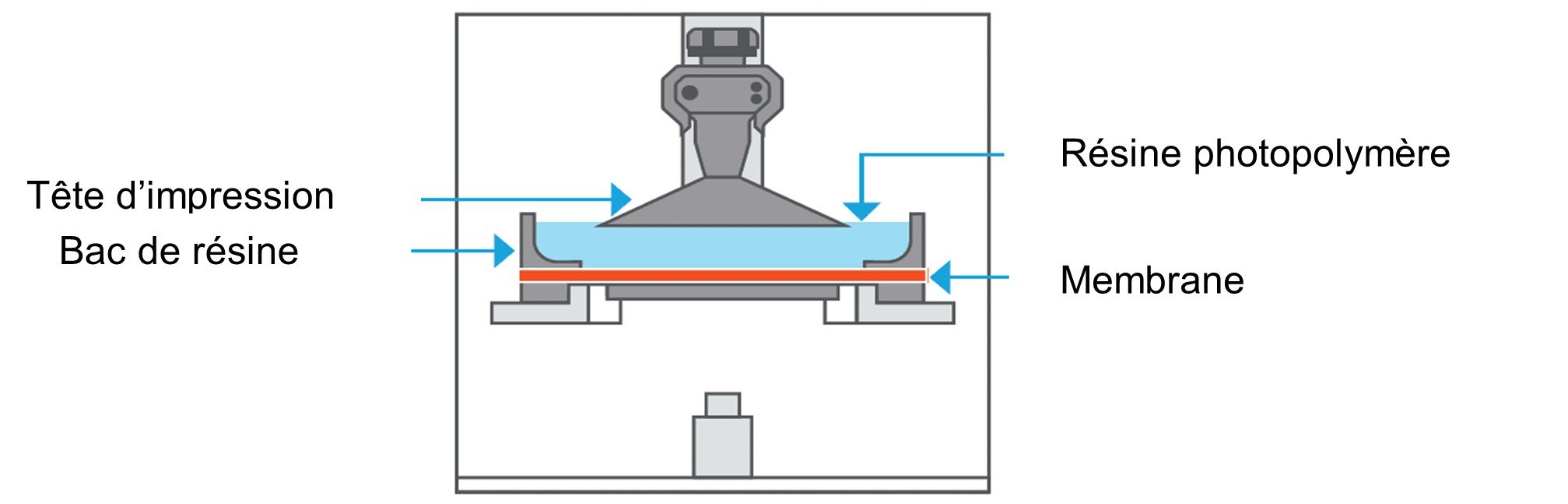 2. Une membrane flexible située au fond de la cuve (sous le plateau de fabrication) s’abaisse légèrement, permettant à une fine couche de résine de s’écouler et de se répartir uniformément.