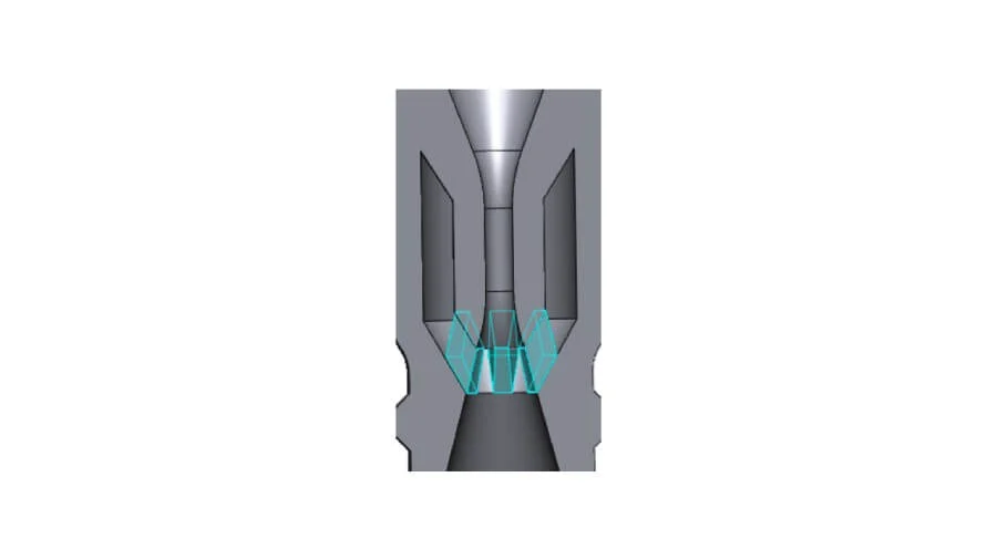 Cette approche intègre des contreforts autoportants (en bleu), reliant la paroi latérale à la sortie centrale du fluide interne. Ces renforts assurent le maintien du port non supporté tout en garantissant un écoulement d’air libre et sans obstruction.