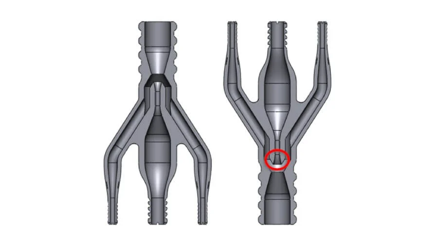Prenons l’exemple de la valve Venturi illustrée ci-dessous (vue en coupe). Cette valve est entièrement autoportante, à condition d’être imprimée dans l’orientation indiquée à gauche (trois ports orientés vers le bas, un vers le haut). A l’inverse, en changeant d’orientation, la sortie centrale du fluide interne (marquée en rouge) nécessiterait des supports.