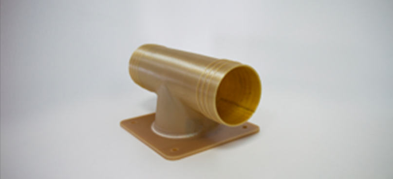 Final, 3D printed ECS duct adapter designed to cool aircraft while on the ground. 3D printed in Stratasys FDM Nylon 12 on the Fortus 450mc.