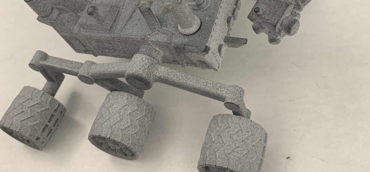 With multiple 3D printers at their disposal, TriMech chose the H350 powered by SAF technology for the job. This decision was made based on SAF technology’s short turnaround time, ability to nest multiple parts in a single build, and relatively cheap printing cost. The build consisted of a high mix of parts for the rover, including wheels, brackets, and the body of the rover as shown here.
