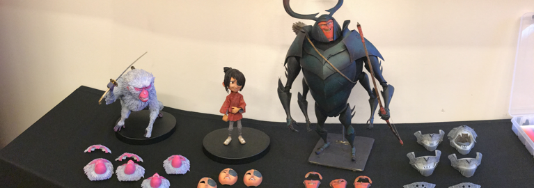 A Beetle puppet displaying the way that the Laika team were able to change the facial characteristics of the puppet for the film Kubo and the Two Strings in high resolution with realism and consistency by utilizing multi-material 3D printed facial parts.