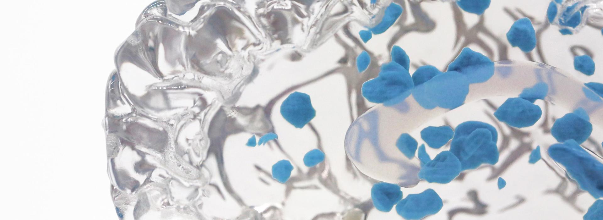 3D printed brain created from PolyJet materials showing lesions from MS (in blue)