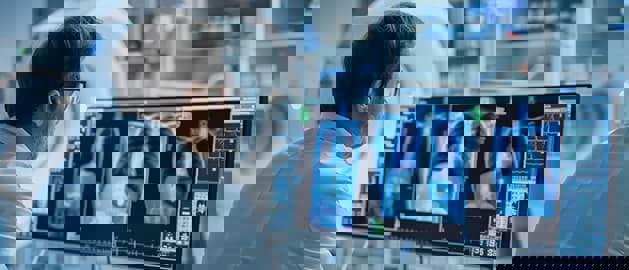 Medical professional reviewing chest X-ray images on diagnostic monitors in a clinical imaging environment
