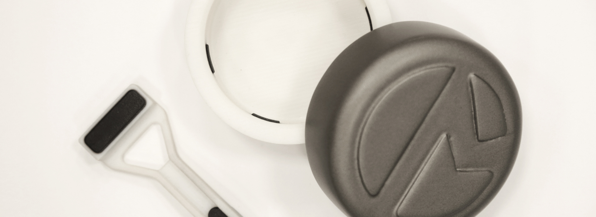 A grasping pincer (left) and packaging lid (right) –   3D printed with Stratasys PolyJet technology. Multimaterial 3D printing was used to create the white structural components and black rubber-like grips all in a single print.