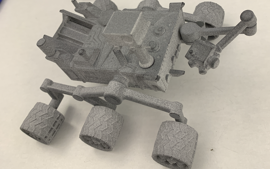 With multiple 3D printers at their disposal, TriMech chose the H350 powered by SAF technology for the job. This decision was made based on SAF technology’s short turnaround time, ability to nest multiple parts in a single build, and relatively cheap printing cost. The build consisted of a high mix of parts for the rover, including wheels, brackets, and the body of the rover as shown here.