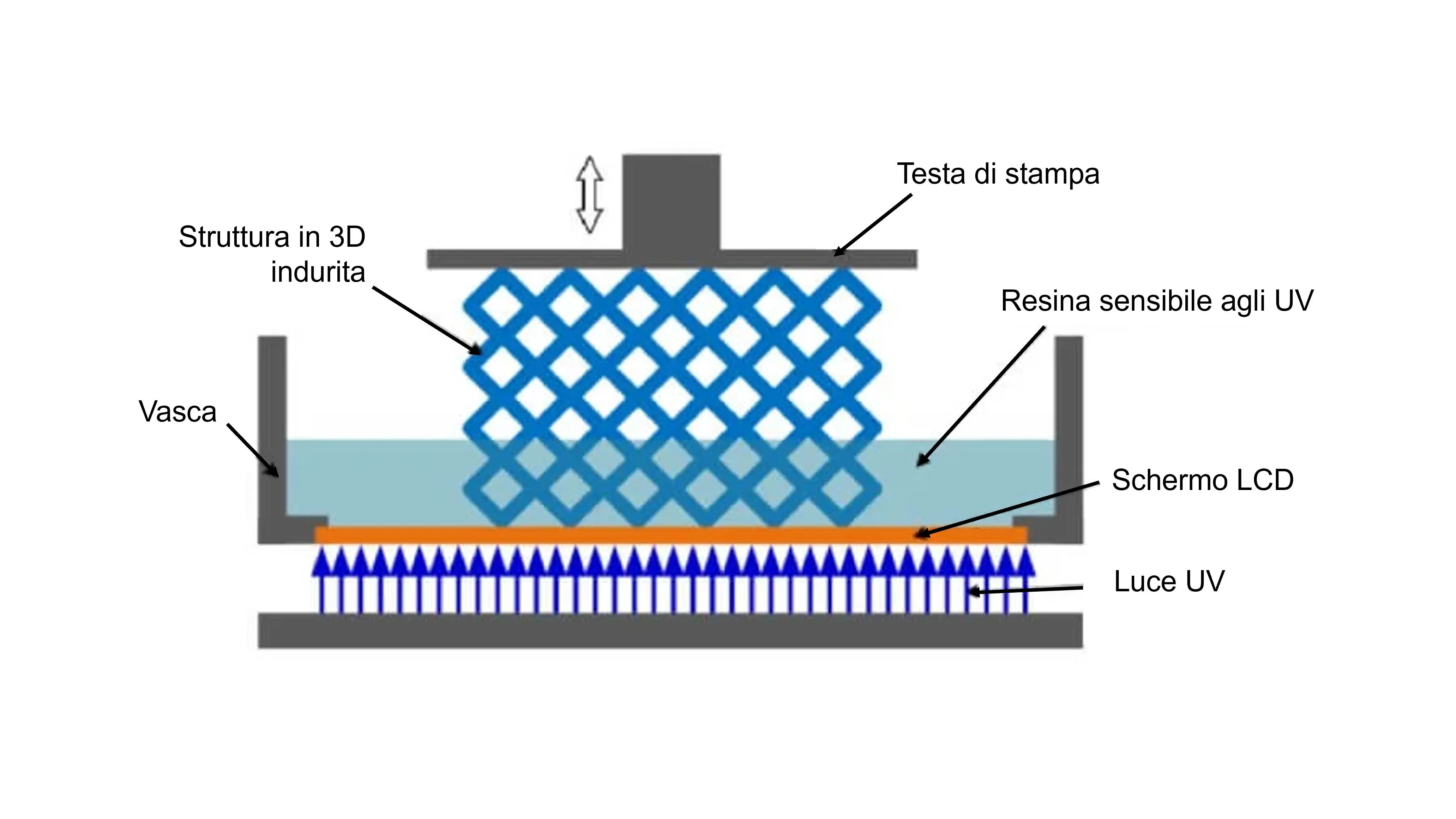 1. La vasca contiene una resina fotopolimerica, ovvero una plastica che indurisce quando viene esposta alla luce.